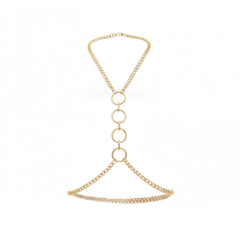 Конструкція м’яко лягає по контуру, обрамляючи зону декольте та акцентуючи талію. Центральні кільця підсилюють драматичність образу й додають нотку домінування. У русі ланцюги красиво перегукуються з тілом, створюючи гру світла та притягальну динаміку.