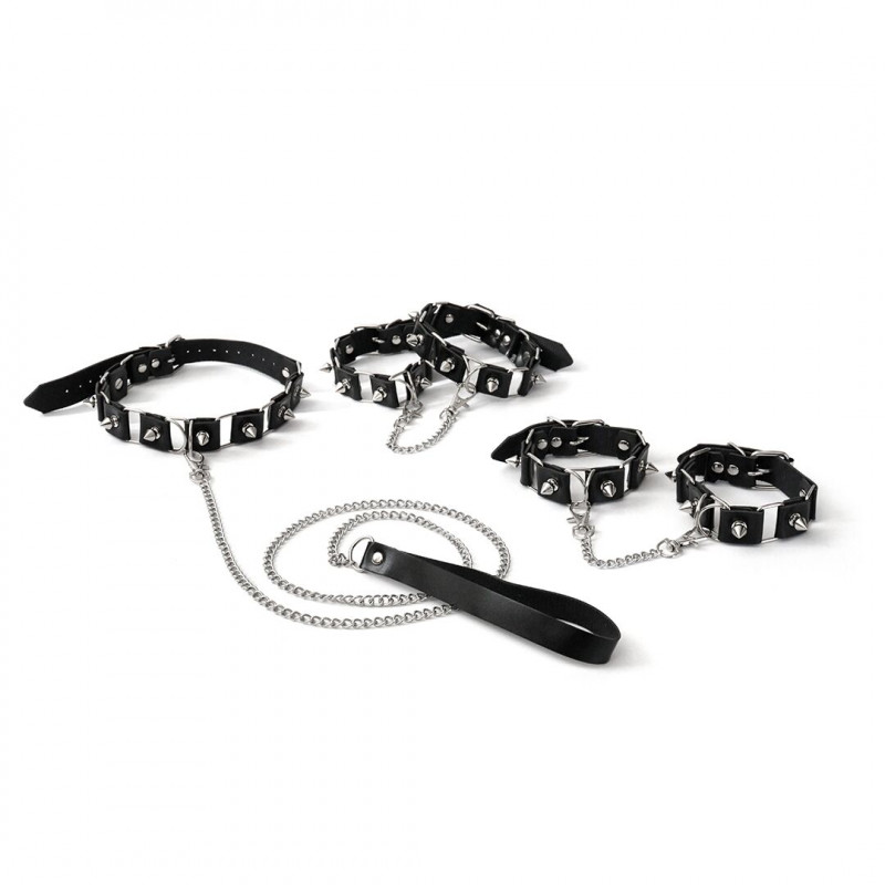 Цей набір для фіксації включає нашийник з повідцем, наручники та поножі. Кожен елемент виготовлений з якісної екошкіри чорного кольору – матеріалу, що приємний на дотик, легкий у догляді та довговічний. Міцна металева фурнітура забезпечує надійність та додає комплекту стильного вигляду. Регульовані ремінці гарантують ідеальну посадку для різних розмірів, а бренд Art of Sex гарантує увагу до деталей та високі стандарти якості.