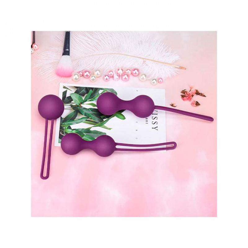 Набір силіконових вагінальних кульок з 3 штук для тренування і зміцнення м'язів піхви з обважнювачами. До набору входять одна кругла кулька і дві здвоєні кульки різної ваги і діаметра. Параметри: - Маленький одинарний: діаметр 3,5 см, загальна довжина 12 см, довжина мотузки 8,5 см, вага 36 грам. - Здвоєні середні: діаметр 3 см, загальна довжина 16 см, довжина мотузки 8,5 см, вага 48 грамів. - Здвоєні великі: діаметр 3,2 см, загальна довжина 16,5 см, довжина мотузки 8,5 см, вага 63 грами. Матеріал: силікон, метал. Колір: фіолетовий