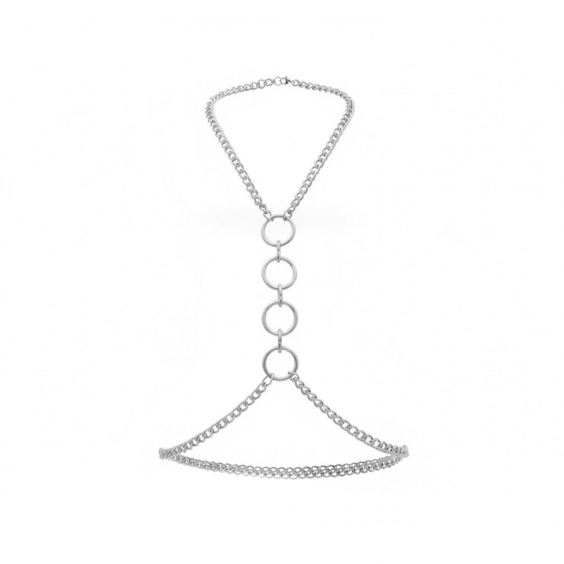 Конструкція м’яко лягає по контуру, обрамляючи зону декольте та акцентуючи талію. Центральні кільця підсилюють драматичність образу й додають нотку домінування. У русі ланцюги красиво перегукуються з тілом, створюючи гру світла та притягальну динаміку.