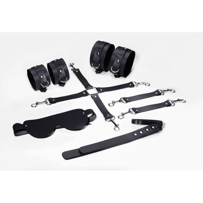 Хрестовина на карабінах: Цей шкіряний конектор є ключовим елементом для гнучкої фіксації. Він дозволяє надійно з'єднувати наручники та поножі, створюючи різноманітні позиції для обмеження рухів — спереду, ззаду, зверху чи знизу, без громіздких конструкцій.