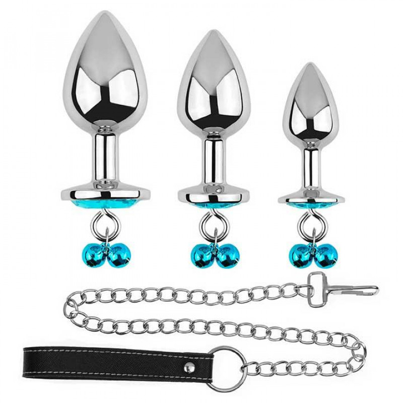 Набор металлических анальных пробок с поводком Бирюзовый 3шт (S/М/L)
