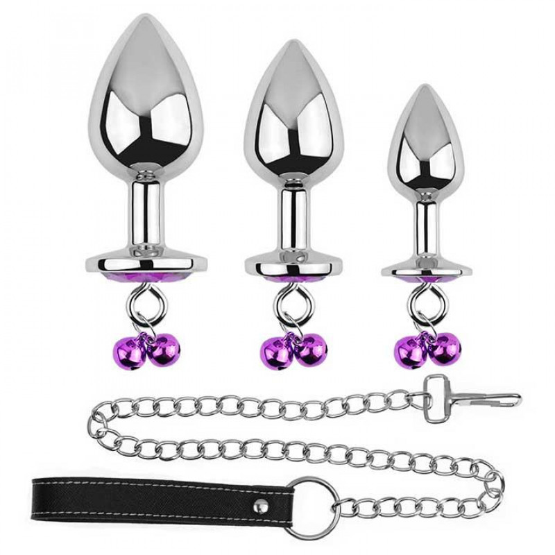 Набор металлических анальных пробок с поводком Фиолетовый 3шт (S/М/L)