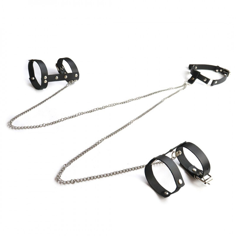 - Витончений метал: Тонкі, але міцні металеві ланцюжки елегантно з'єднують нашийник із прикрасами для рук, створюючи єдиний, гармонійний образ. Метал додає елемент холодної, стриманої сили та візуальної привабливості, підкреслюючи динаміку контролю.