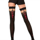 Особливістю цієї моделі є декоративні елементи на задній частині. Тут розташований ефектний малюнок червоного кольору, що привертає увагу. Трохи нижче малюнка розміщені милі кокетливі бантики, також у червоному кольорі. Від бантиків і до середини гомілки тягнеться тонка вертикальна лінія, що завершується стилізованим зображенням геральдичної лілії. Ця комбінація деталей надає панчохам особливого шарму та дозволяє створити незабутній образ.