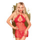 Цей комплект – справжня ода жіночності, що поєднує в собі ностальгічний шарм 60-х років та сучасну сексуальність. Червона напівпрозора сорочка, виконана з легкої тканини в горошок, прикрашена витонченим мереживом, що додає їй особливого шику. Ажурна тканина в зоні декольте делікатно підкреслює красу грудей, створюючи запаморочливий ефект. Завдяки тоненьким зав'язкам на шиї та під грудьми, ви можете легко регулювати посадку, створюючи хвилюючий силует, що привертає увагу. Додатковий акцент – призовний дизайн спинки, що завдяки зав'язкам, грайливо відкриває попку.
