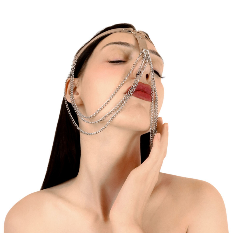 Матеріал: Основні елементи виконані з високоякісної екошкіри, що забезпечує приємний дотик та довговічність. Металева фурнітура, що використовується для кріплення ланцюжків, є міцною та гіпоалергенною, гарантуючи безпеку використання. Тонкі металеві ланцюжки, що створюють основний декоративний ефект, виблискують на світлі, привертаючи увагу до обличчя та підкреслюючи контури.